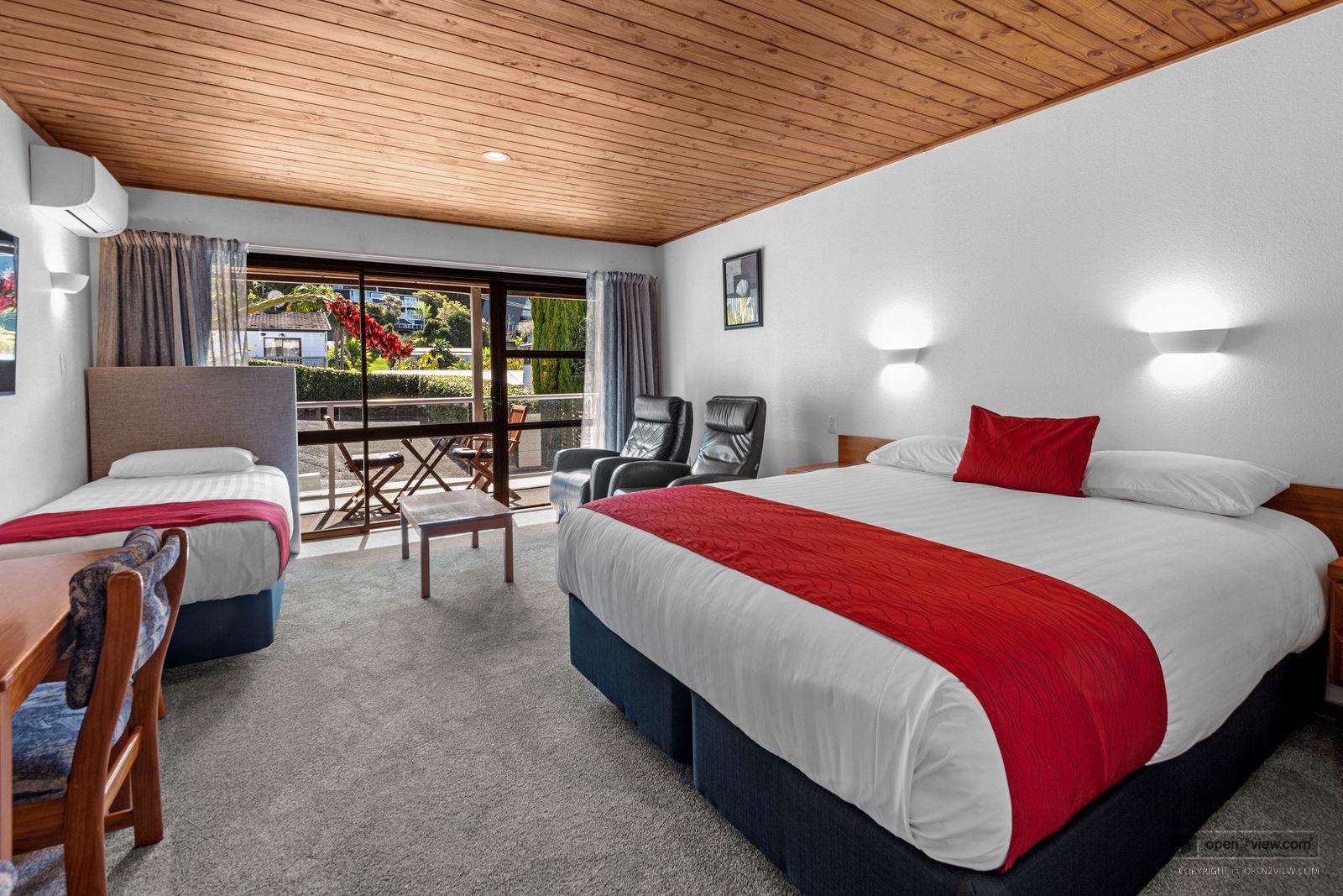These 5 studio units are up one flight of stairs (have undercover parking). In each unit there is a kitchen which is fully self-contained, and in the main room there is a quality king size bed, single bed, sofa, table and chairs and the bathroom is off the main room. They are spacious units with 43 inch to 50 inch Smart LED TVs and a side balcony which gets the afternoon sun. Ideal to relax and enjoy a glass of wine.